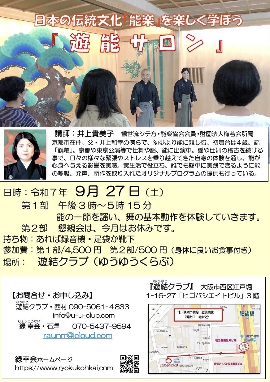 月に一回大阪・肥後橋にある「遊結クラブ」で能の謡と仕舞の団体稽古が行われています。